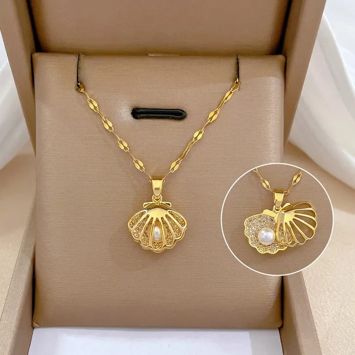 قلادة صدفية فاخرة بحجر لؤلؤ من الفلاذ المقاوم لصدأ شبيه ذهب 21 قراط